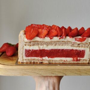 Versez le tout dans un moule en silicone ou un cercle de 14cm et ajoutez vos morceaux de fraises fraîches.