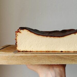 Comparé au cheesecake classique, le cheesecake basque est plus riche en crème et son appareil est plus liquide. Il ne contient pas de base biscuitée non plus, juste du fromage frais Philadelphia, des oeufs, du sucre, de la crème liquide entière et un peu de fécule. Il se cuit à température très élevée, ce qui donne une surface brunie voire brûlée.