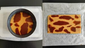 Le lendemain, commencez à abaisser votre pâte sucrée "nature" entre deux feuilles de papier sulfurisé ou des feuilles de papier guitare.À mi-chemin, placez des bouts de pâte sucrée cacao de différentes formes par-dessus l'autre pâte sucrée, puis continuez à l'abaisser jusqu'à 4mm d'épaisseur. Détaillez 2 bandes de 26 cm de long par 6 cm de haut et un disque de 16 cm de diamètre.