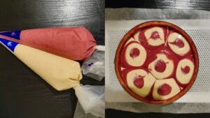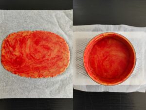 Beurrez légèrement les parois du cercle, placez vos bandes de papier cuisson (ou votre bande de silpain) et déposez-le sur une plaque recouverte d'une feuille de papier sulfurisé ou d'un tapis de cuisson.