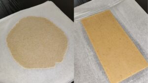 Le lendemain, abaissez votre pâte à 4mm d'épaisseur entre deux feuilles de papier sulfurisé ou des feuilles de papier guitare.
