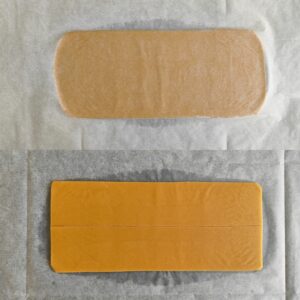 Le lendemain, abaissez votre pâte à 4mm d'épaisseur entre deux feuilles de papier sulfurisé ou des feuilles de papier guitare.