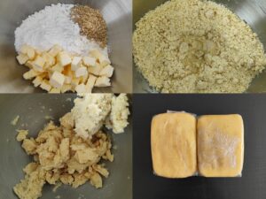 Quand la pâte commence à se former, déposez-la sur votre plan de travail et fraisez-la afin de bien amalgamer le tout. Façonnez 2 pâtons (ce sera plus simple à abaisser qu'un seul grand pâton).