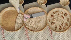 Enfournez pendant 15min. À la sortie du four, retirez le cercle sans vous brûler et laissez refroidir. Mélangez le jaune d'oeuf avec la crème liquide. À l'aide d'un pinceau, appliquez votre dorure sur le fond de tarte refroidi ainsi que les bords. Réenfournez pendant 5min à 160°C, chaleur tournante. Laissez refroidir complètement avant de passer à la crème de noix.
