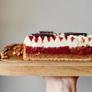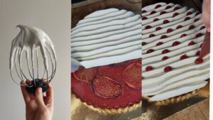 Le lendemain, abaissez votre pâte à 3mm d'épaisseur entre deux feuilles de papier sulfurisé ou des feuilles de papier guitare. (N'hésitez pas à la remettre au frais/congélateur pendant quelques minutes avant de foncer votre cercle. La pâte sucrée n'aime pas la chaleur et devient impossible à manipuler.) Détaillez 2 bandes de 32 cm de long par 3 cm de haut et un disque de 20 cm de diamètre (je fais toujours plusieurs bandes au cas où).